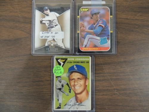 LOT 3 (1) 1954 TOPPS #146 BASEBALL CARD DOM JOHNSON, 2009 TOPPS #18 LIMITED EDITION BASEBALL CARD CY YOUNG. 20/99, 1987 LEAF #36 BASEBALL ROOKIE CARD GREG MADDUX. AS SHOWN. VIEW PICTURE FOR DETAIL.