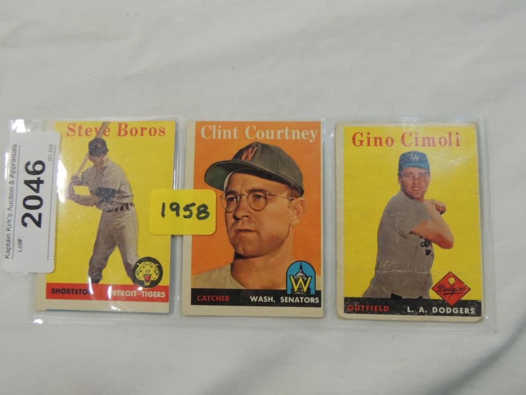STEVE BOROS, CLINT COURTNEY, GINO CIMOLI BASEBALL PLAYER CARDS, COLLECTIBLE, TRADING CARDS, BASEBALL MEMORABILIA, SPORTS MEMORABILIA, GOOD CONDITION, AS SHOWN SEE PHOTO FOR MORE DETAILS.