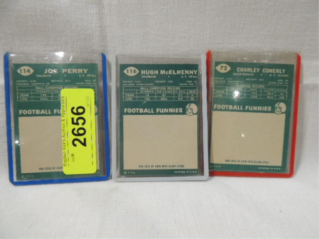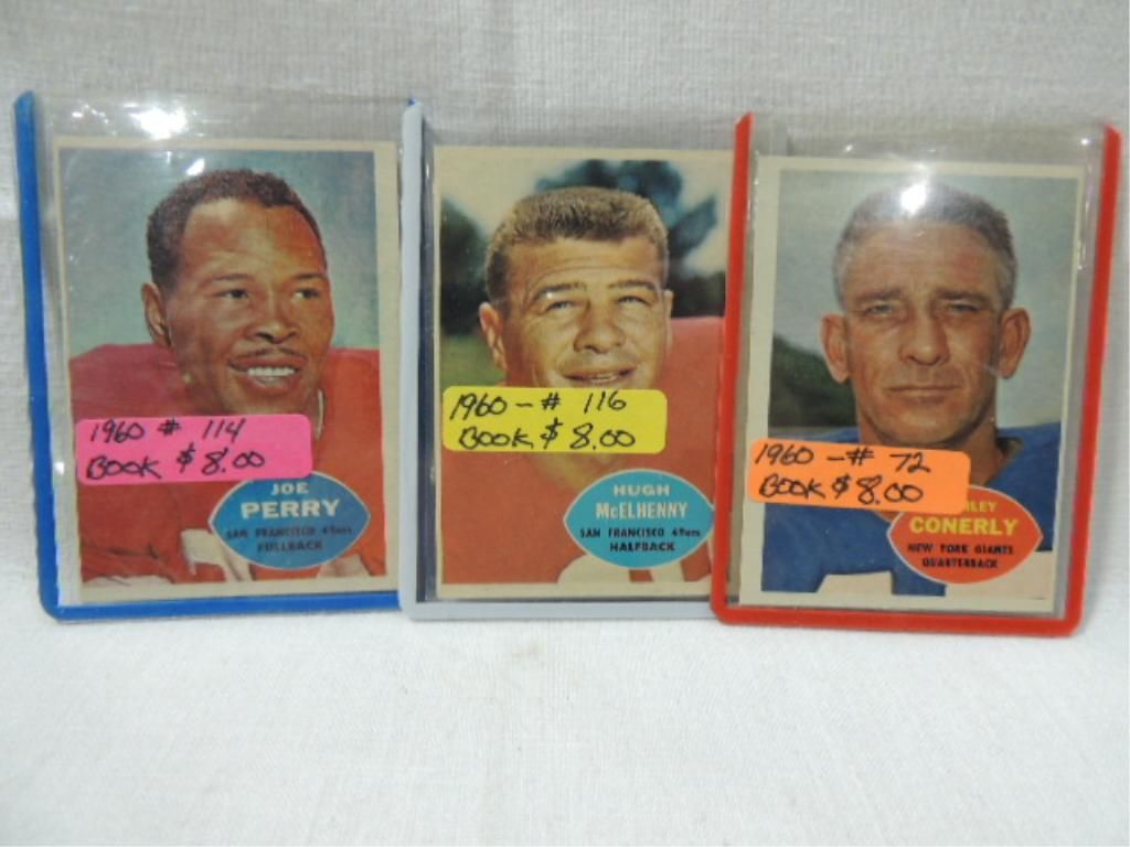 LOT 3 1960 TOPPS FOOTBALL PLAYERS CARDS. JOE PERRY # 114, CHARLEY CONERLY #72, HUGH MCELHENNY #116. AS SHOWN. SEE PHOTO FOR DETAILS.