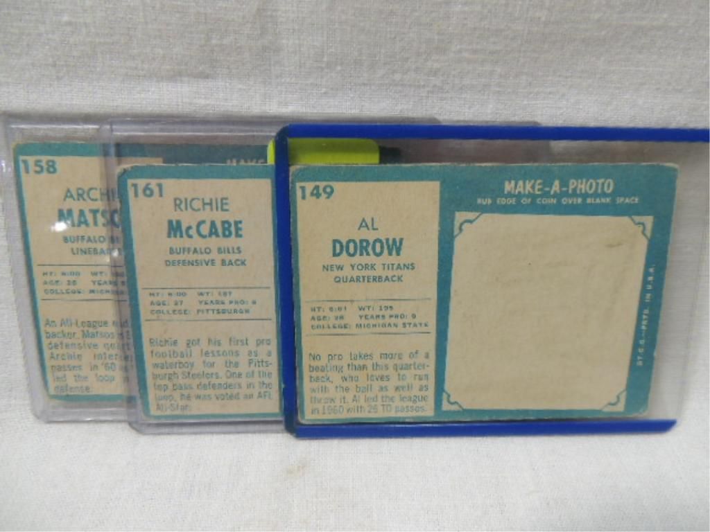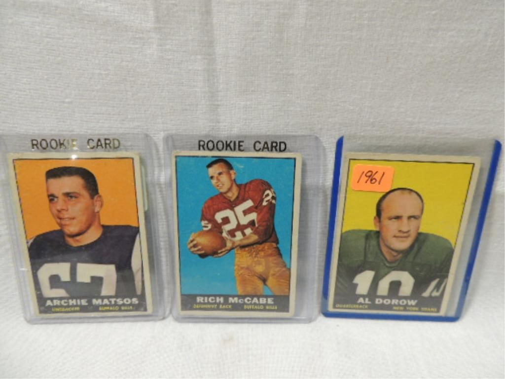 LOT 3 1961 TOPPS FOOTBALL PLAYER CARDS. RICH MCCABE ROOKIE CARD, ARCHIE MATSOS ROOKIE CARD, AL DOROW. AS SHOWN. SEE PHOTO FOR DETAILS.