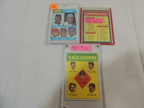 1962 TOPPS #76 BASEBALL CHECK LIST CARD HAS BEEN MARKED ON, 1963 TOPPS #6 BASEBALL ERA LEADERS WHITEY FORD,EDDIE FISHER & 1965 TOPPS #4 BASEBALL HOME RUN LEADER MAYS, WILLIAMS. AS SHOWN. VIEW PICTURE FOR DETAIL.