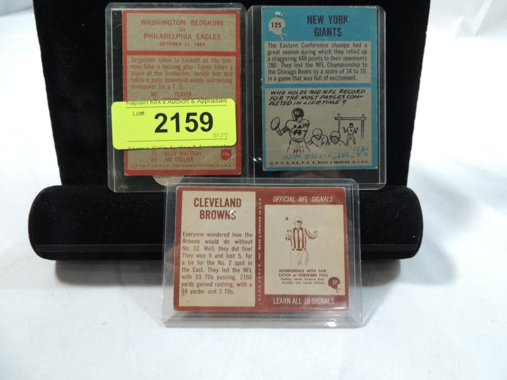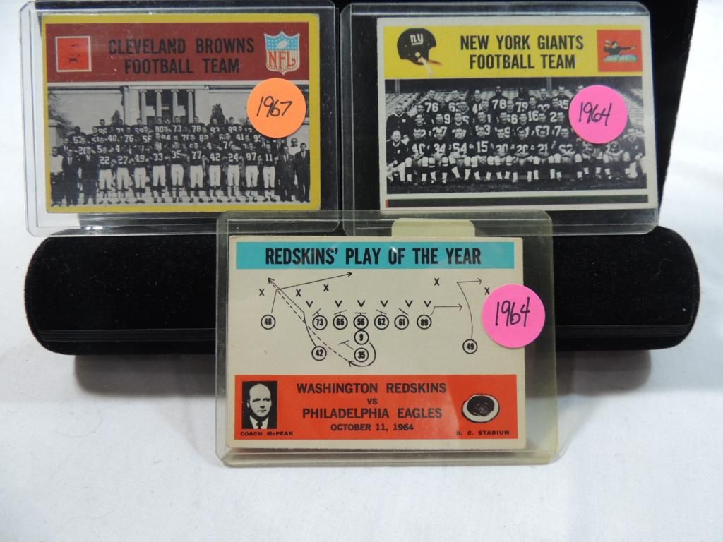 1964 NEW YORK GIANTS FOOTBALL TEAM #125, 1964 REDSKINS PLAY OF THE YEAR #196, 1967 CLEVELAND BROWNS FOOTBALL TEAM #37. FOOTBALL TRADING CARDS. AS SHOWN. SEE PHOTO FOR MORE DETAILS.