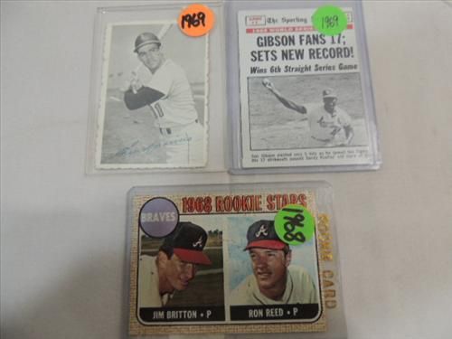 LOT 3 1969 TOPPS #162 BASEBALL PLAYER CARD BOB GIBSON, 1968 TOPPS #76 BASEBALL ROOKIE STAR CARD FOR BRAVES & 1969 TOPPS #6 DECKLE EDGE BASEBALL CARD LUIS APARICIO. AS SHOWN. VIEW PICTURE FOR DETAIL.