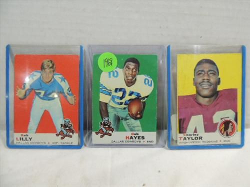 LOT 3 1969 TOPPS #6, 67, 53 FOOTBALL PLAYER CARDS: HAYES, TAYLOR, LILLY. AS SHOWN. VIEW PICTURE FOR DETAIL.