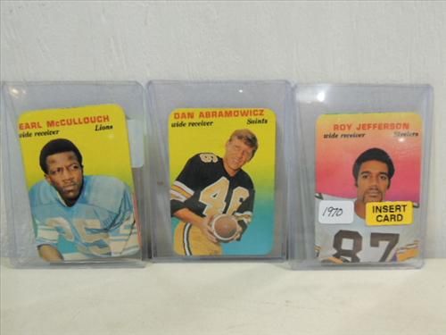 LOT 3 1970 TOPPS #8, 14, 17 OF 33 FOOTBALL CARDS: EARL MCCULLOUGH, DAN ABRAMOWICZ, ROY JEFFERSON. AS SHOWN. VIEW PICTURE FOR DETAIL.