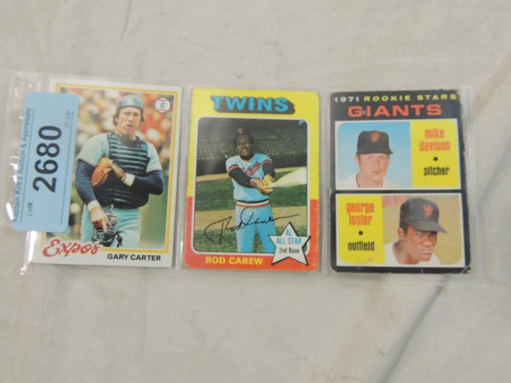 GARY CARTER, ROD CAREW, MIKE DAVISON, GEORGE FOSTER BASEBALL PLAYER CARDS. TRADING CARDS. COLLECTIBLE. BASEBALL MEMORABILIA. GOOD CONDITION AS SHOWN. SEE PHOTO FOR MORE DETAILS.