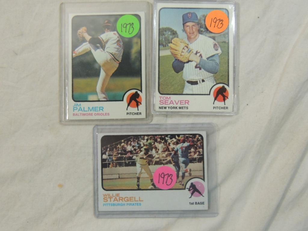 WILLIE STARGELL, JIM PALMER, TOM SEAVER BASEBALL PLAYER CARDS. TRADING CARDS. COLLECTIBLE. BASEBALL MEMORABILIA. GOOD CONDITION AS SHOWN. SEE PHOTO FOR MORE DETAILS.
