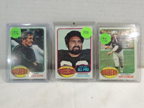 LOT 3 1976 TOPPS FOOTBALL CARDS: KEN STABLER, FRANCO HARRIS & GEORGE BLANDA. AS SHOWN. VIEW PICTURE FOR DETAIL.