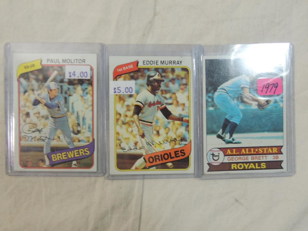 PAUL MOLITOR, EDDIE MURRAY, GEORGE BRETT BASEBALL PLAYER CARDS. TRADING CARDS. COLLECTIBLE. BASEBALL MEMORABILIA. GOOD CONDITION AS SHOWN. SEE PHOTO FOR MORE DETAILS.
