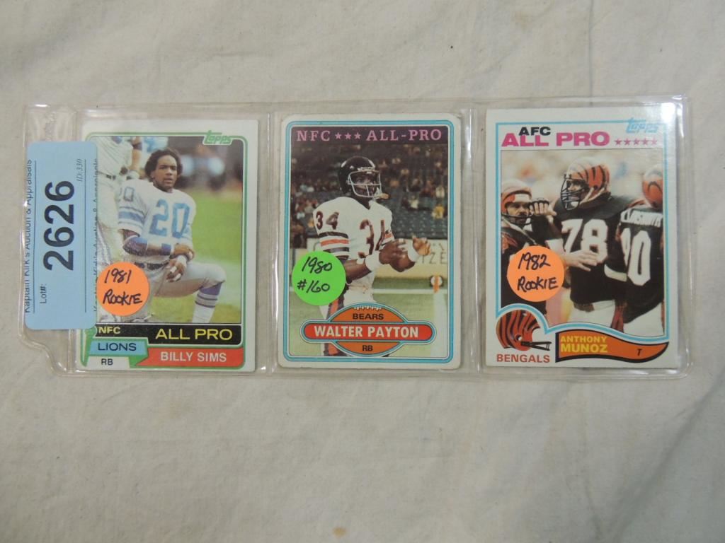 BILLY SIMS, WALTER PAYTON, ANTHONY MUNOZ FOOTBALL PLAYER CARDS. TRADING CARDS. COLLECTIBLE. FOOTBALL MEMORABILIA. GOOD CONDITION AS SHOWN. SEE PHOTO FOR MORE DETAILS.