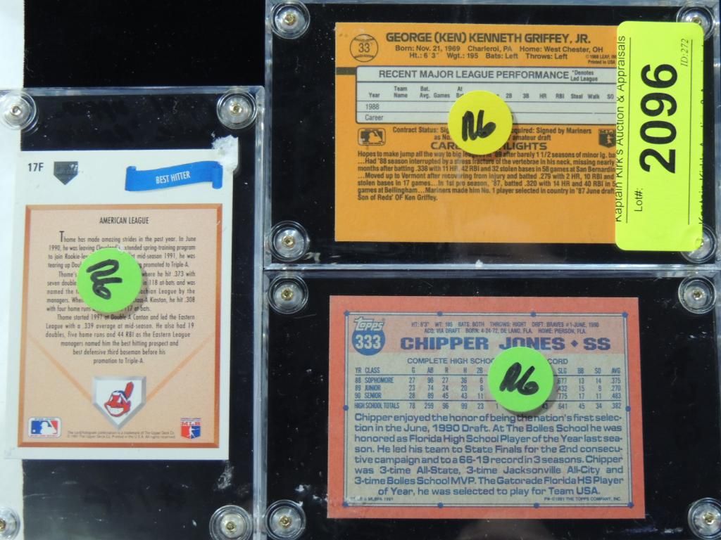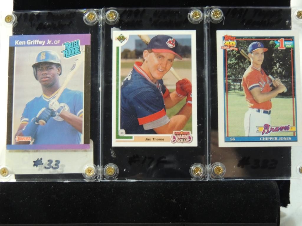 1989 DONRUSS KEN GRIFFEY JR. #33. 1991 TOPPS CHIPPER JONES #333 ROOKIE CARD, 1991 UPPER DECK JIM THOME #17F ROOKIE CARD. BASEBALL PLAYER CARD. TRADING CARD. AS SHOWN. SEE PHOTO FOR MORE DETAILS.