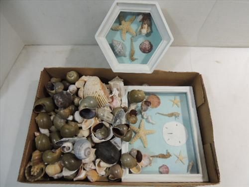 LOT 3 (2) DISPLAY CASE SEA SHELLS, BAROMETER & LOOSE SEA SHELLS. WALL HANGINGS. AS SHOWN. VIEW PICTURE FOR DETAIL.