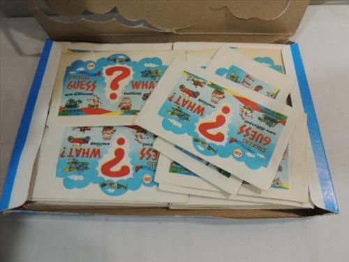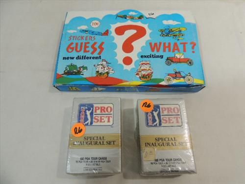 LOT 3 (2) GOLFING PRO SET TRADING CARD SETS, 1 GUESS WHAT 10 CENT STICKERS WAX PACKS & DISPLAY BOX. AS SHOWN. VIEW PICTURE FOR DETAIL.