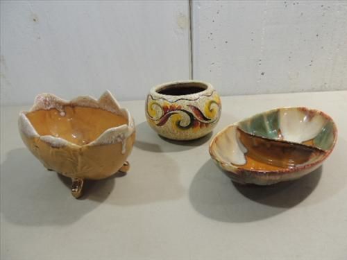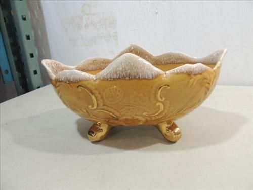 LOT 3 (2) MID CENTURY MODERN CERAMIC HAEGER & OZARK FRONTIER BANANA BOATS & 1 EARTHERN WARE PLANTER. AS SHOWN. VIEW PICTURE FOR DETAIL.