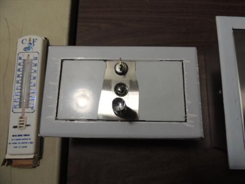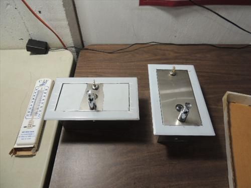 LOT 3 (2) NEW NEVER USED LOCKING SOAP DISPENCERS & THERMOMETER. AS SHOWN. VIEW PICTURE FOR DETAIL.