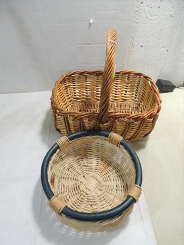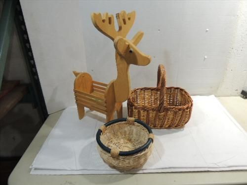 LOT 3 (2) REED WOVEN BASKETS & PIN WOOD REINDEER 24"H. AS SHOWN. VIEW PICTURE FOR DETAIL.