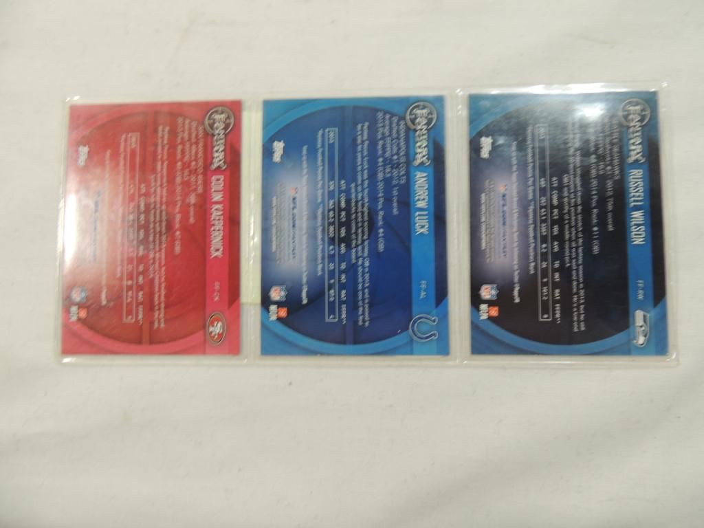 RUSSELL WILSON, ANDREW LUCK, COLIN KAEPERNICK FOOTBALL PLAYER CARDS. TRADING CARDS. COLLECTIBLE. FOOTBALL MEMORABILIA. GOOD CONDITION AS SHOWN. SEE PHOTO FOR MORE DETAILS.