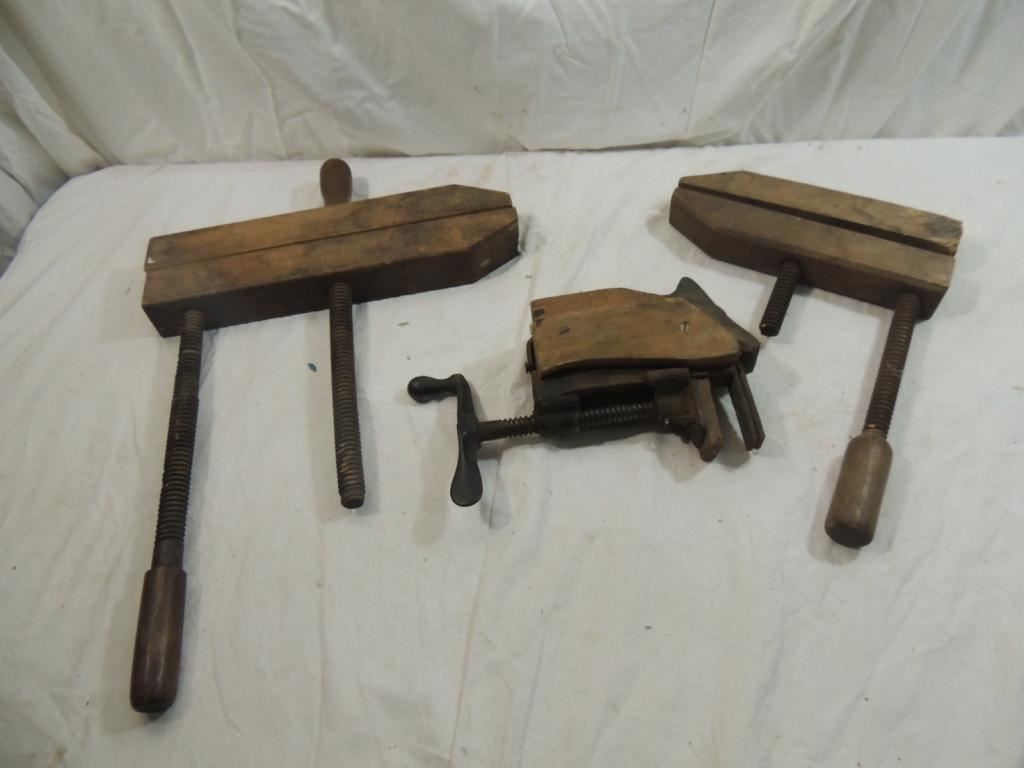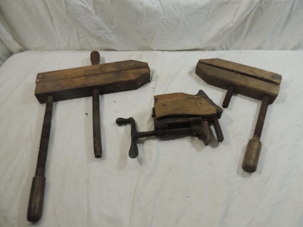 ANTIQUE WOOD WORKING VISES, WOODEN VISES, COLLECTIBLE WOOD WORKING TOOLS, ANTIQUE HAND TOOLS, AS SHOWN SEE PHOTO FOR MORE DETAILS