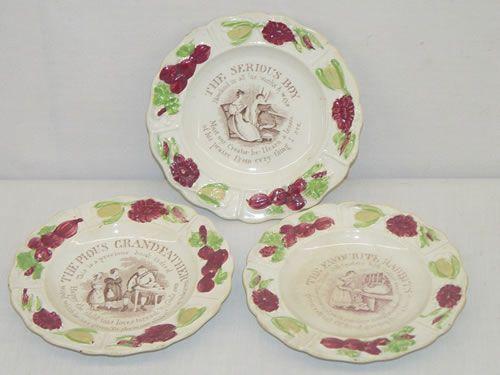LOT (3) 4 7/8" STAFFORDSHIRE CHILDRENS PLATES W/ ROCCO BORDERS: "THE FAVORITE RABBITS" (STAINS), "THE PIOUS GRANDFATHER" (STAINS), & "THE SERIOUS BOY" (1" HAIRLINE)