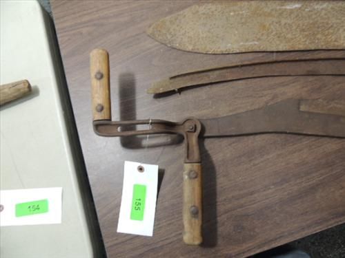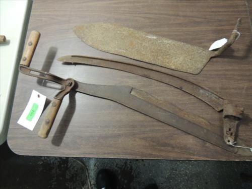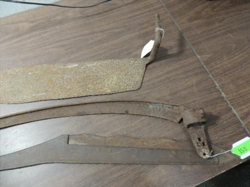 LOT 3 ANTIQUE FARM EQUIPMENT IRON SCYTHES OR SICKLES. 2 HAVE BLADES ONLY NO HANDLES. AS SHOWN. VIEW PICTURE FOR DETAIL.