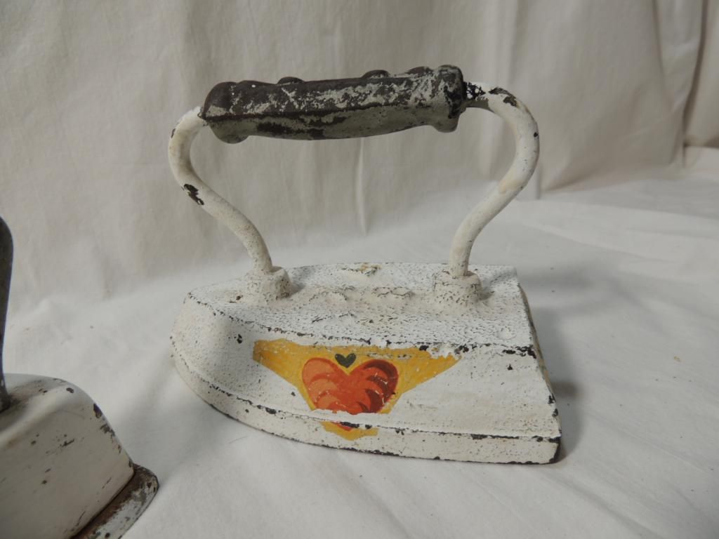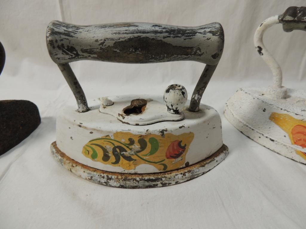 3 ANTIQUE IRONS. RUSTED IRON. PAINTED IRON. PRIMATIVE, WOODEN HANDLE, CAST IRON. HEAVY DUTY. AS SHOWN. SEE PHOTO FOR MORE DETAILS.