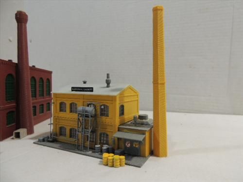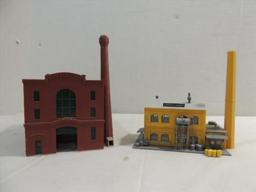 LOT 3 ASSEMBLED N GAUGE 2 FACTORY BUILDINGS & CHIMNEY, 1 N GUAGE TRAIN CAR CRANE. AS SHOWN. VIEW PICTURE FOR DETAIL.
