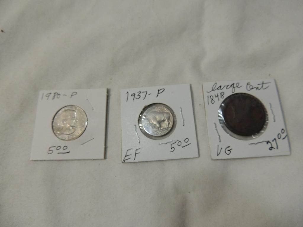 1980 ONE DOLLAR COIN, 1848 LARGE CENT, 1937 BUFFALO NICKEL. US CURRENCY. COIN COLLECTIBLE. UNITED STATES COINS. MONEY COLLECTIBLE. AS SHOWN SEE PHOTO FOR MORE DETAILS.