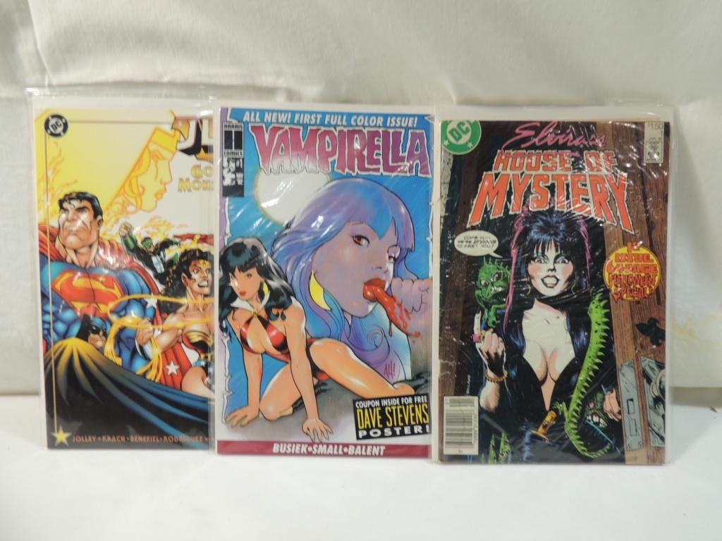 LOT 3 ASSORTED COMICS ELVIRAS, VAMPIRELLA, JLA