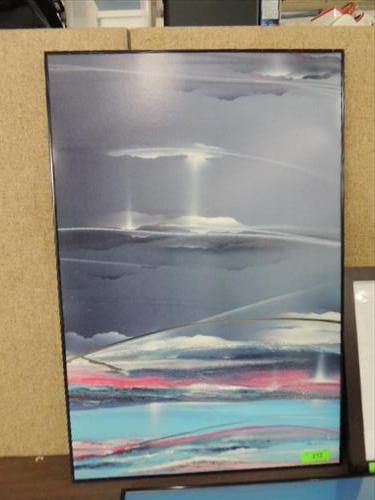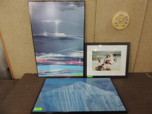 LOT 3 ASSORTED FRAMED POSTER ART: MOUNTAINS, ABSTRACT, VICTORIAN. AS SHOWN. VIEW PICTURE FOR DETAIL.