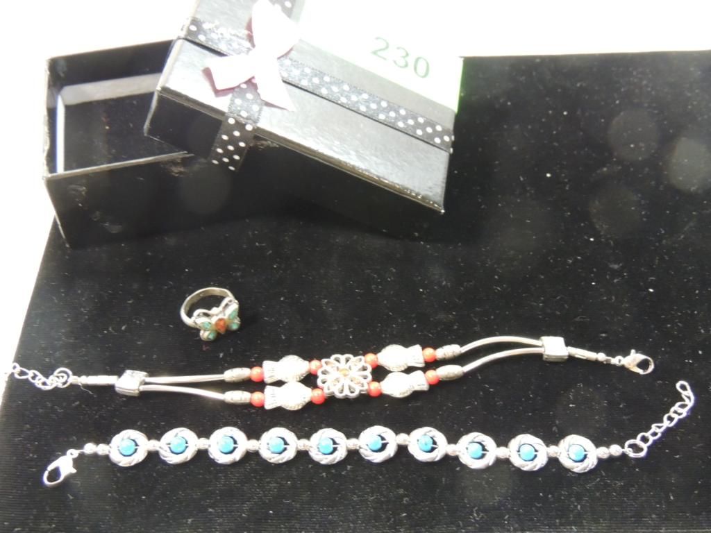 TWO SILVERTONE AND BEAD BRACELETS AND BUTTERFLY RING. AS SHOWN. SEE PHOTO FOR MORE DETAILS.
