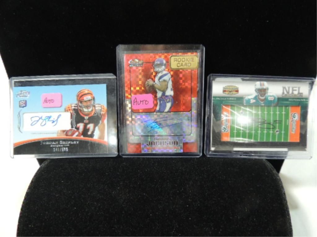 NFL GRIDIRON PATRICK TURNER AUTOGRAPH CARD. AS SHOWN.2010 TOPPS PRIME JORDAN SHIPLEY AUTOGRAPHED CARD. 141/599 AS SHOWN.TOPPS ROOKIE CARD AUTOGRAPH CARD TOPPS ROOKIE CARD AUTOGRAPH CARD. PLEASE BE ADVISED, AND INFORMED REGARDING SIGNATURES OR AUTOGRAPHS THAT WE SELL AT AUCTION: WE ARE NOT AUTHENTICATORS, AND WE DO NOT AUTHENTICATE, OR VALIDATE ANY AUTOGRAPHS OR SIGNATURES THAT WE OFFER AT AUCTION. SOME AUTOGRAPHS OR SIGNATURES MAY COME WITH AN AUTHENTICATION FROM ANY ONE OF LITERALLY HUNDREDS OF AUTHENTICATORS ACROSS THE COUNTRY, AND AROUND THE WORLD. WE DO NOT ENDORSE ANY AUTHENTICATOR, NOR DO WE GUARANTEE THAT ANY AUTOGRAPH OR SIGNATURE IS AUTHENTIC, OR THAT IT WILL PASS AUTHENTICATION BY ANY AUTHENTICATOR. ALL AUTOGRAPHS OR SIGNATURES ARE SOLD