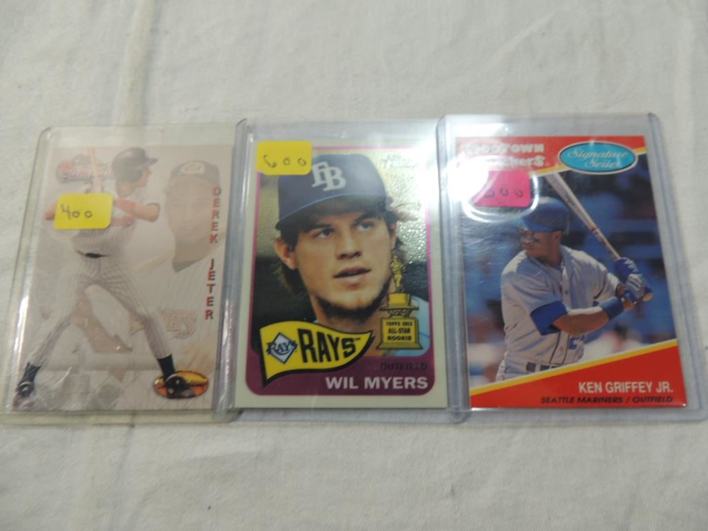 DEREK JETER, WIL MYERS, KEN GRIFFEY JR. BASEBALL PLAYER CARDS. TRADING CARDS. COLLECTIBLE. BASEBALL MEMORABILIA. GOOD CONDITION AS SHOWN. SEE PHOTO FOR MORE DETAILS.