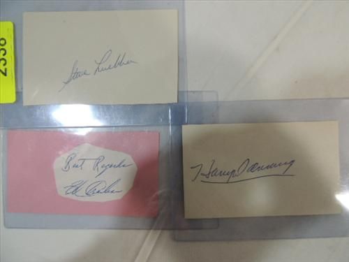 LOT 3 BASEBALL PLAYER AUOTGRAPHS: ED CHARLES, STEVE LUEBBER & HARRY DANNING WITH JAMES SPENCE STAMP ON BACK OF 3X5 CARD. AS SHOWN. VIEW PICTURE FOR DETAIL.