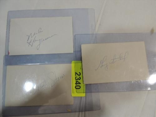 LOT 3 BASEBALL PLAYER AUOTGRAPHS: GARY SUTHERLAND, MIKE HARGROVE & BRENT STROM WITH JAMES SPENCE STAMP ON BACK OF 3X5 CARD. AS SHOWN. VIEW PICTURE FOR DETAIL.