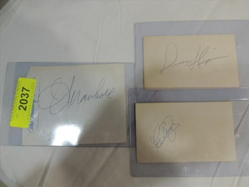 LOT 3 BASEBALL PLAYER AUTOGRAPH: CURT BLEFARY, JIM MARSHALL & DUANE KUIPER. INLCUDES JAMES SPENCE STAMP OF APPROVAL ON BACK OF CARD. AS SHOWN. VIEW PICTURE FOR DETAIL.
