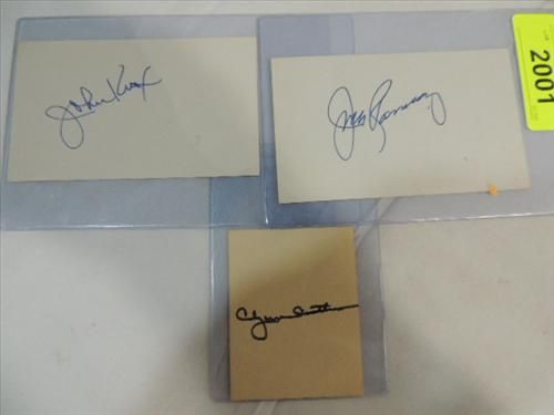 LOT 3 BASEBALL PLAYER AUTOGRAPHS: JACK RAMSEY, CLYDELL CASTLEMAN & JOHN KRUK SOA. INCLUDES JAMES SPENCE STAMP OF APPROVAL ON BACK OF CARD. AS SHOWN. VIEW PICTURE FOR DETAIL.