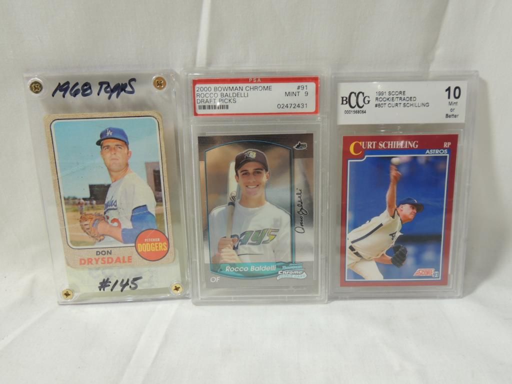 TOPPS 1968 #145 DON DRYSDALE, GRADED BASEBALL CARD 2000 BOWMAN BALDELLI, GRADED BASEBALL CARD 1991 SCORE CURT SCHILLING. AS SHOWN SEE PHOTO FOR MORE DETAILS.