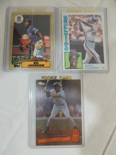 LOT 3 BASEBALL ROOKIE CARDS: TOPPS - BO JACKSON, TOPPS - DARRYL STRAWBERRY & CLASSIC DEREK JETER. AS SHOWN. VIEW PICTURE FOR DETAIL.