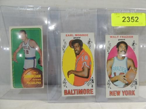 LOT 3 BASKETBALL PLAYER CARDS: 68-69 WALT FRAZER, 68-69 EARL MONROE & 69-70 BILL CUNNINGHAM. AS SHOWN. VIEW ICTURE FOR DETAIL.
