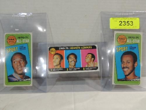 LOT 3 BASKETBALL PLAYER CARDS: 70-71 ELGIN BAYLOR, 70-71 LOU HUDSON & 69-70 ASSISTS LEADERS. AS SHOWN. VIEW PICTURE FOR DETAIL.