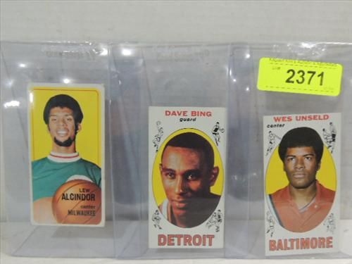 LOT 3 BASKETBALL PLAYER CARDS: 70-71 LEW ALCINDOR, 68-69 DAVE BING & WES UNSELD. AS SHOWN. VIEW PICTURE FOR DETAIL.
