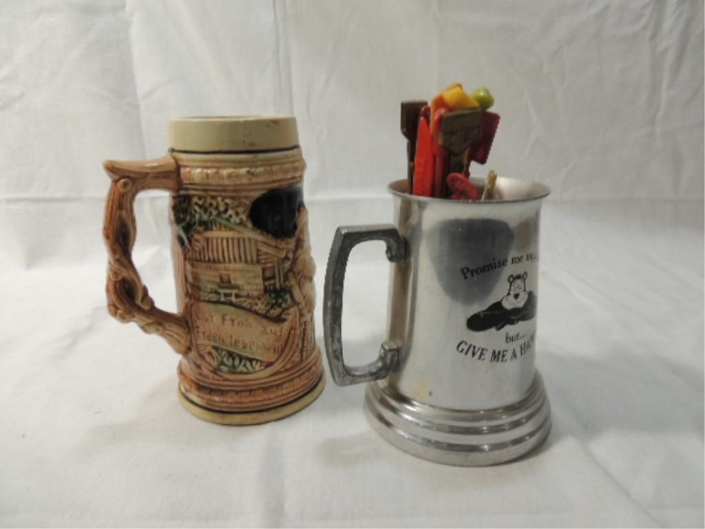 LOT 3 BRWERIANA COLLECTIBLES" HAMMS BEER STEIN, ASSORTED SWIZZEL STICKS, & CERAMIC BEER STEIN. AS SHOWN. VIEW PICTURE FOR DETAIL.