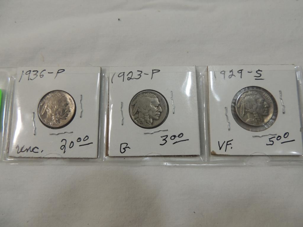 1923, 1936, 1929 BUFFALO NICKELS US CURRENCY, CURRENCY COIN COLLECTIBLE, COLLECTIBLE AS SHOWN SEE PHOTO FOR MORE DETAILS.