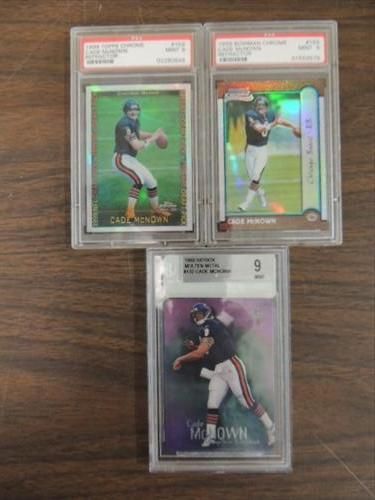 LOT 3 CADE MCNOWN GRADED ROOKIE FOOTBALL CARDS: 1999 TOPPS #159, 1999 BOWMAN #155 & 1999 SKYBOX #132. AS SHOWN. VIEW PICTURE FOR DETAIL.