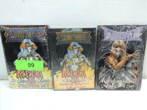 LOT 3 CHROME PRODUCTION: LADY DEATH TRADING MEGA CARDS. AS SHOWN. VIEW PICTURE FOR DETAIL.