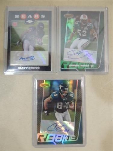 LOT 3 COA AUTOGRAPHED FOOTBALL CARDS: MATT FORTE, CHANNING CROWDER, CHAD OWENS. COA IS ON THE FOOTBALL CARD. AS SHOWN. VIEW PICTURE FOR DETAIL. PLEASE BE ADVISED, AND INFORMED REGARDING SIGNATURES OR AUTOGRAPHS THAT WE SELL AT AUCTION: WE ARE NOT AUTHENTICATORS, AND WE DO NOT AUTHENTICATE, OR VALIDATE ANY AUTOGRAPHS OR SIGNATURES THAT WE OFFER AT AUCTION. SOME AUTOGRAPHS OR SIGNATURES MAY COME WITH AN AUTHENTICATION FROM ANY ONE OF LITERALLY HUNDREDS OF AUTHENTICATORS ACROSS THE COUNTRY, AND AROUND THE WORLD. WE DO NOT ENDORSE ANY AUTHENTICATOR, NOR DO WE GUARANTEE THAT ANY AUTOGRAPH OR SIGNATURE IS AUTHENTIC, OR THAT IT WILL PASS AUTHENTICATION BY ANY AUTHENTICATOR. ALL AUTOGRAPHS OR SIGNATURES ARE SOLD