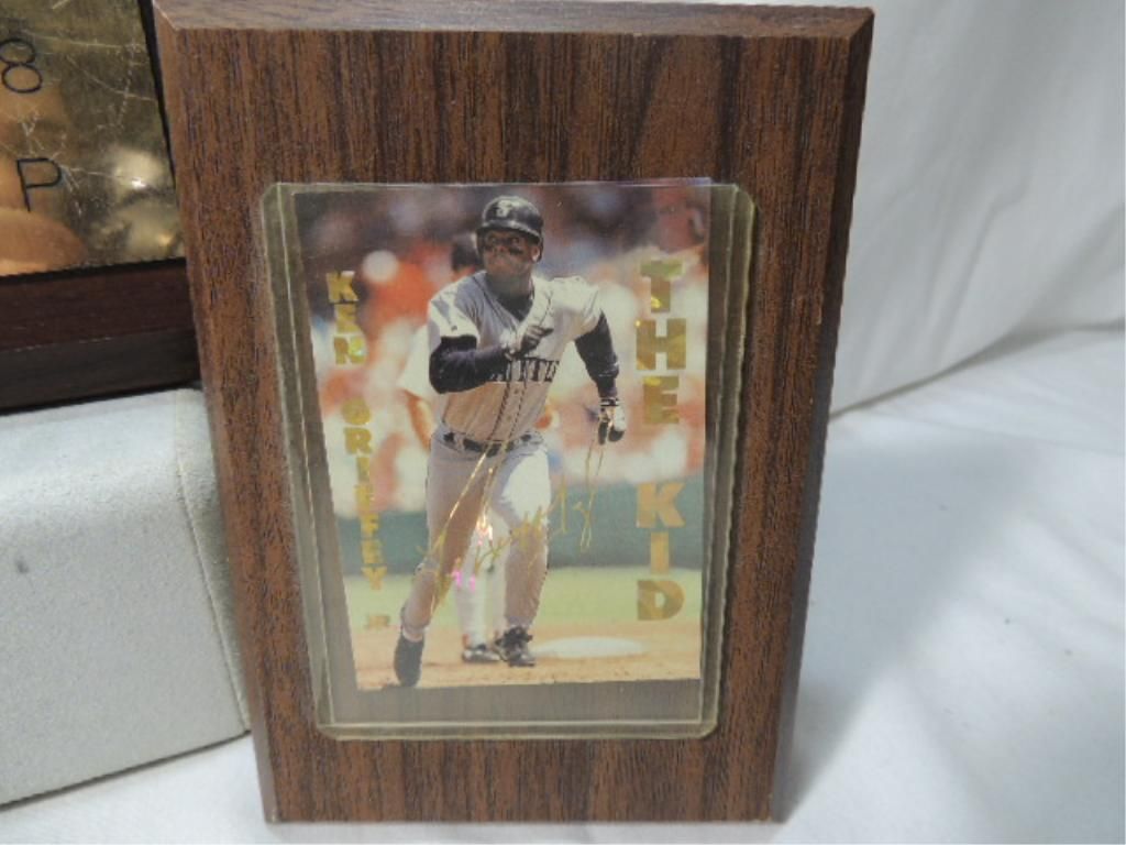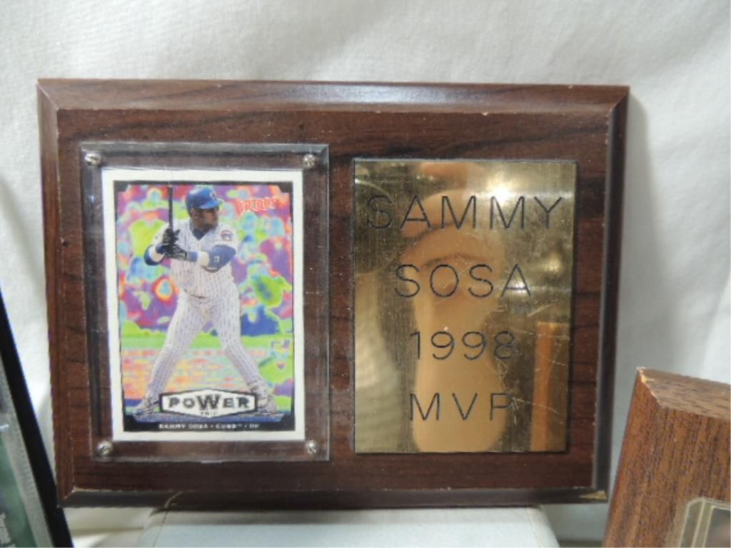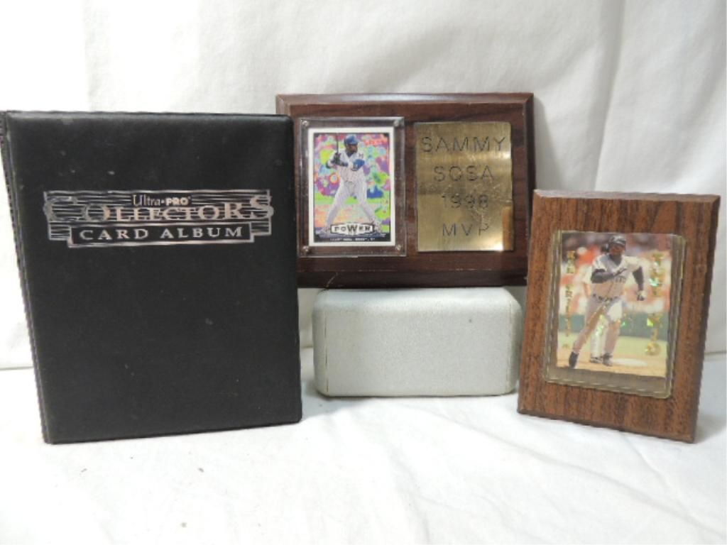 KEN GRIFFEY JR BASEBALL CARD MOUNTED PLAQUE. SAMMY SOSA 1998 MVP PLAQUE WITH CARD. COLLECTORS ALBUM BASKETBALL, FOOTBALL, BASEBALL CARDS INCLUDED