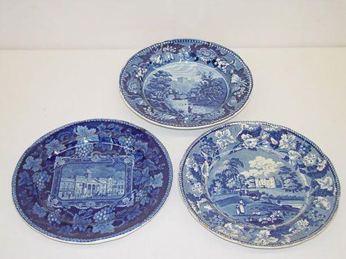 LOT (3) DARK BLUE STAFFORDSHIRE TABLE ITEMS: (1) 10 1/4" PLATE-LONDON VIEWS ST. PHILIPS CHAPEL BY WOODS, (1) 10 1/4" PLATE DALGUISE PERTHSHIRE (SMALL RIM CHIP), & (1) 10" FLANGED SOUP-DILSTON TOWER NORTHUMBERLAND