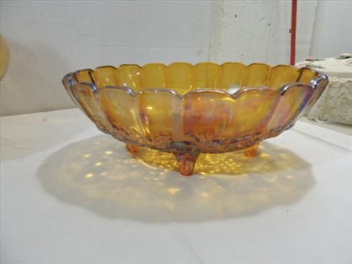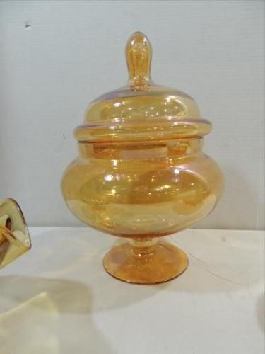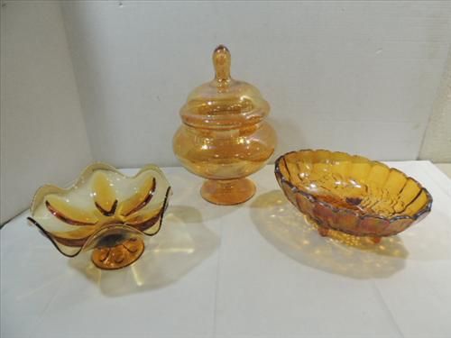 LOT 3 DECORATIVE AMBER CARNIVAL GLASS: AMBER GLASS LARGE COMPOTE, HEAVY GRAPE PATTERN CENTER PIECE & LIDDED OVERSIZED CENTER PIECE. AS SHOWN. VIEW PICTURE FOR DETAIL.