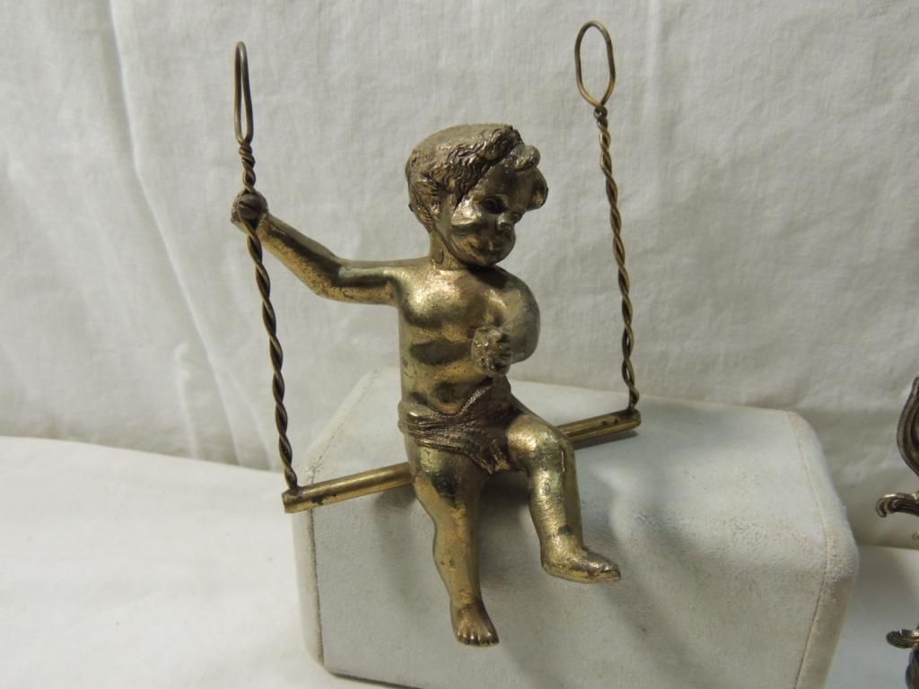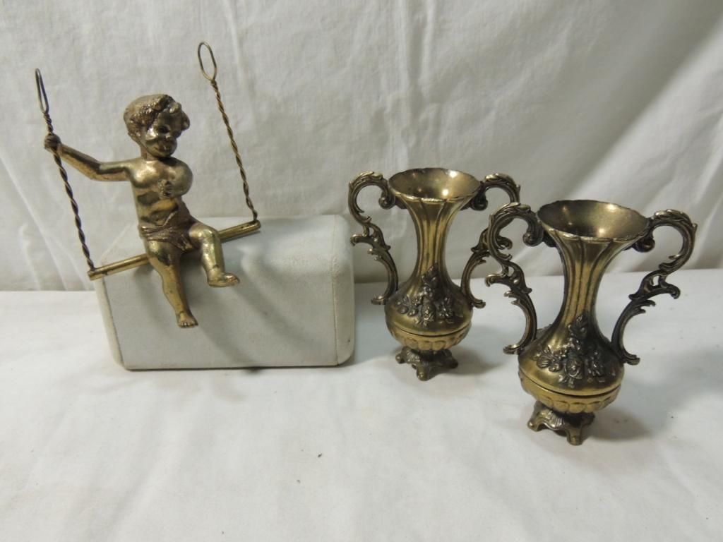 SOLID HEAVY BUD VASES DECORATIVE ITALIAN AND CHERUB ON SWING. AS SHOWN SEE PHOTO FOR MORE DETAILS.